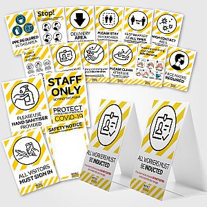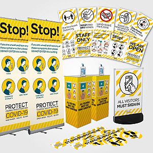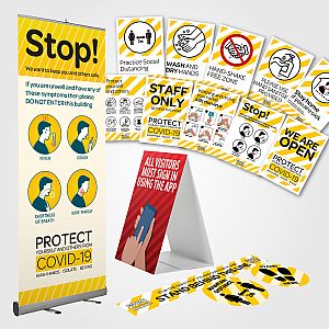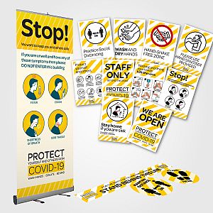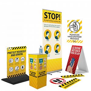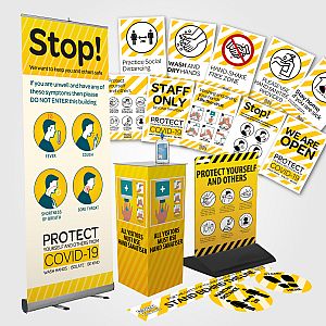 A Comprehensive package for offices and reception areas, Includes safety posters, floor graphics, Rollup banner and a hand sanitiser station.