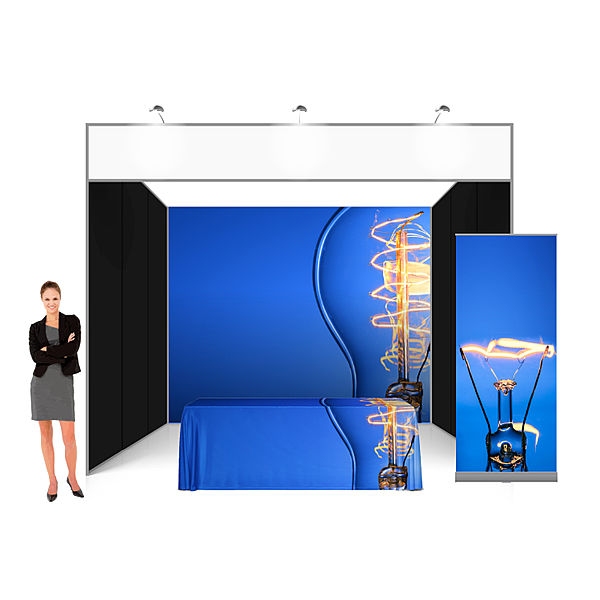 The included freestanding Rollup is ideal to promote your key products and works best when placed at the front of your booth facing the direction of the foot traffic.